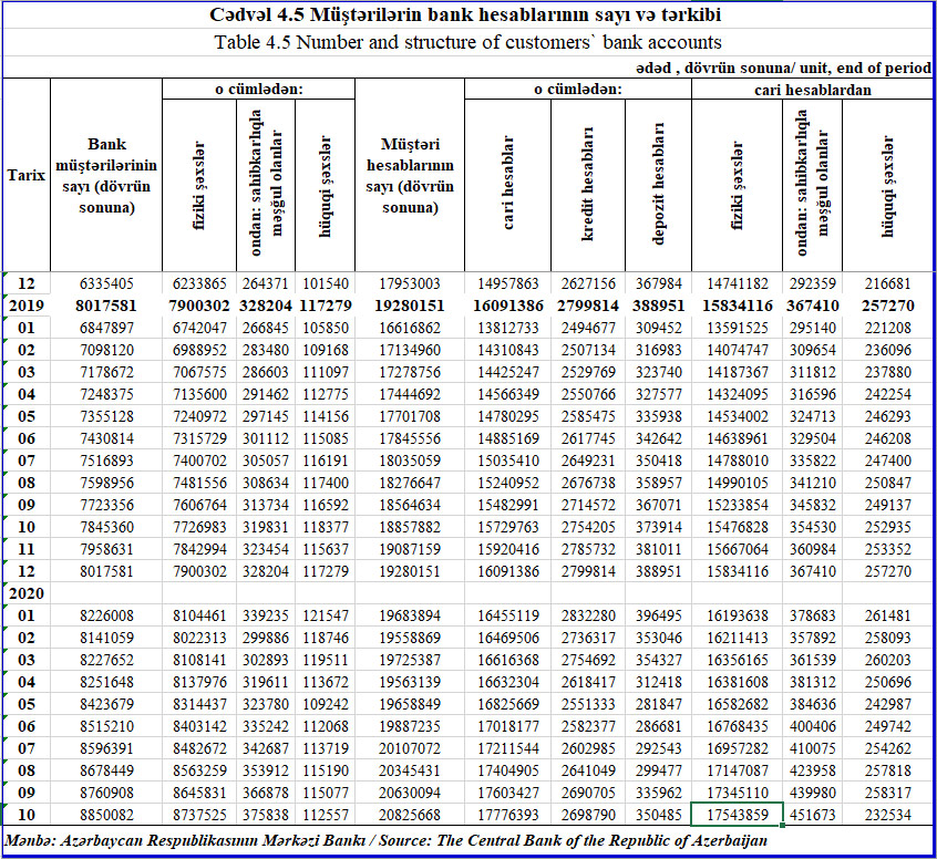 Kredit hesabları 2020-ci ilin 10 ayı ərzində 101 min 24, depozit hesabları isə 38 min 466 azalıb. Kredit hesablarında azalma Oktyabr ayında da davam edib (8 min 85 azalma).