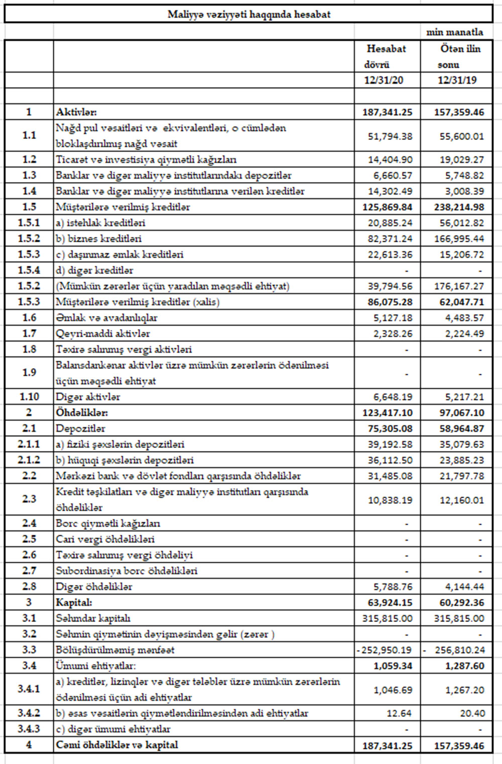 Ötən ilin xalis mənfəətin hesabına Bankın yığılmış zərəri 256 milyon 810 min manatdan 252 milyon 950 min manata düşüb.