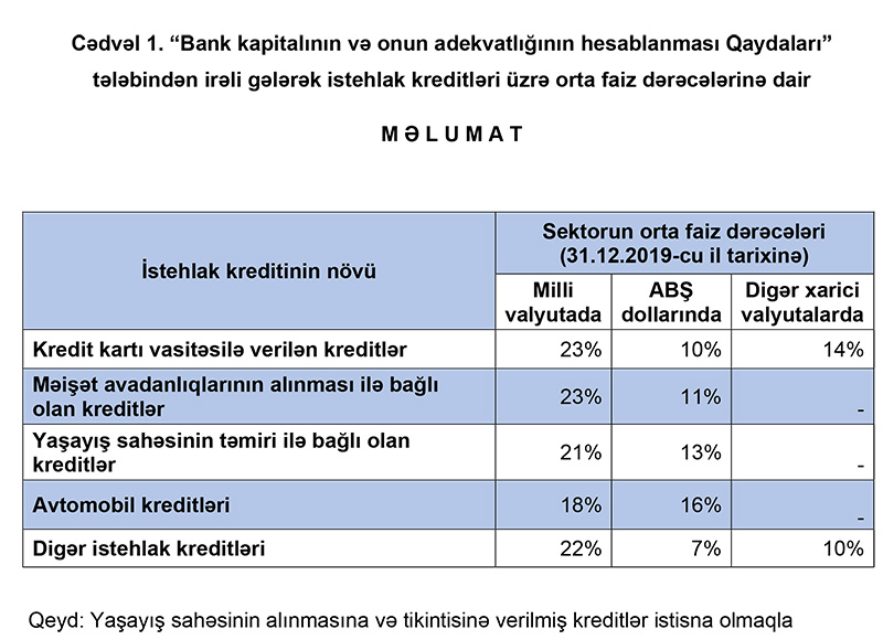 Orta faiz dərəcəsi kredit kartı vasitəsilə verilən kreditlər üzrə 24%, məişət avadanlıqlarının alınması ilə bağlı olan kreditlər üzrə 23%, yaşayış sahəsinin təmiri ilə bağlı olan kreditlər üzrə 24%, avtomobil kreditlər üzrə 19%, digər istehlak kreditləri üzrə 23% olub.