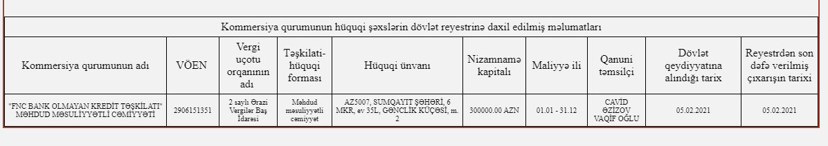 05 Fevral 2021-ci il tarixində "FNC Bank Olmayan Kredit Təşkilatı" MMC dövlət qeydiyyatına alınıb.