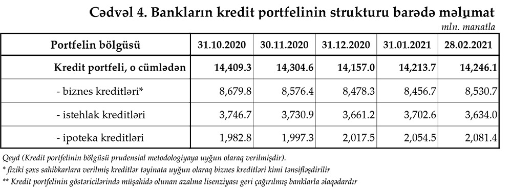 28 Fevral 2021-ci il tarixində bankların cəmi kredit portfeli 14 milyard 246,1 milyon manat təşkil edib.