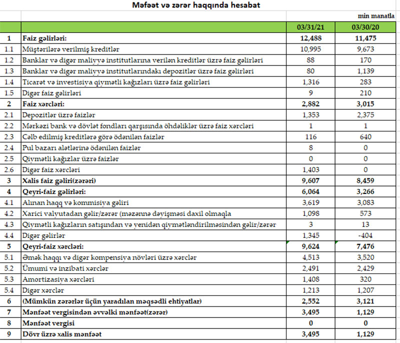 Müqayisə üçün qeyd edək ki, 2020-ci ilin ilk rübündə “Rabitəbank”ın cəmi əməliyyat gəlirləri 14 milyon 741 min manat, cəmi əməliyyat xərcləri 10 milyon 491 min manat, əməliyyat mənfəəti 4 milyon 250 min manat təşkil etmişdi. Bank əməliyyat mənfəətindən 3 milyon 121 min manat mümkün zərərlər üçün yaradılan məqsədli ehtiyatlara ayırdığından həmin dövrü 1 milyon 129 min manat xalis mənfəət ilə başa vurmuşdu.