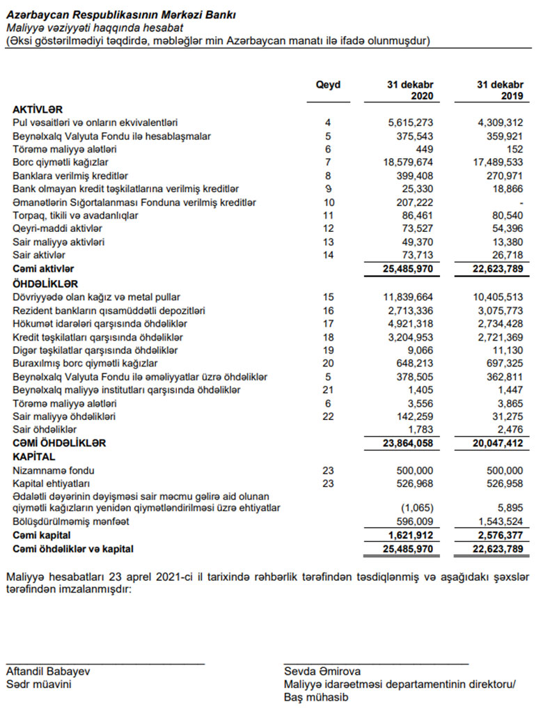 Azərbaycan Mərkəzi Bankı (AMB) 2020-ci ili 52 milyon 485 min manat xalis mənfəətlə başa vurub.