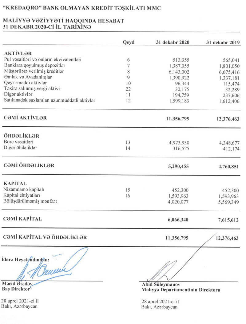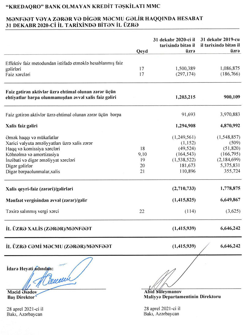 “Kredaqro” MMC bank olmayan kredit təşkilatı (BOKT) 2020-ci ili 1 milyon 416 min manat xalis zərərlə başa vurub. Halbuki, BOKT 2019-cu ildən 6 milyon 646 min manat xalis mənfəətlə çıxmışdı.