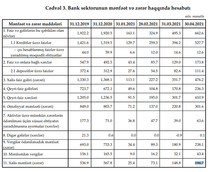 Marja Mərkəzi Banka istinadən xəbər verir ki, Azərbaycanın bank sektoru 2021-ci ilin yanvar-aprel dövrünü 194,7 milyon manat xalis mənfəət ilə başa vurub.