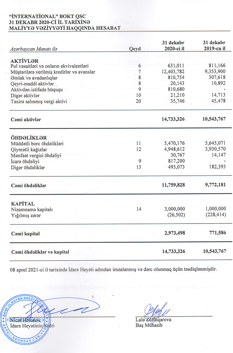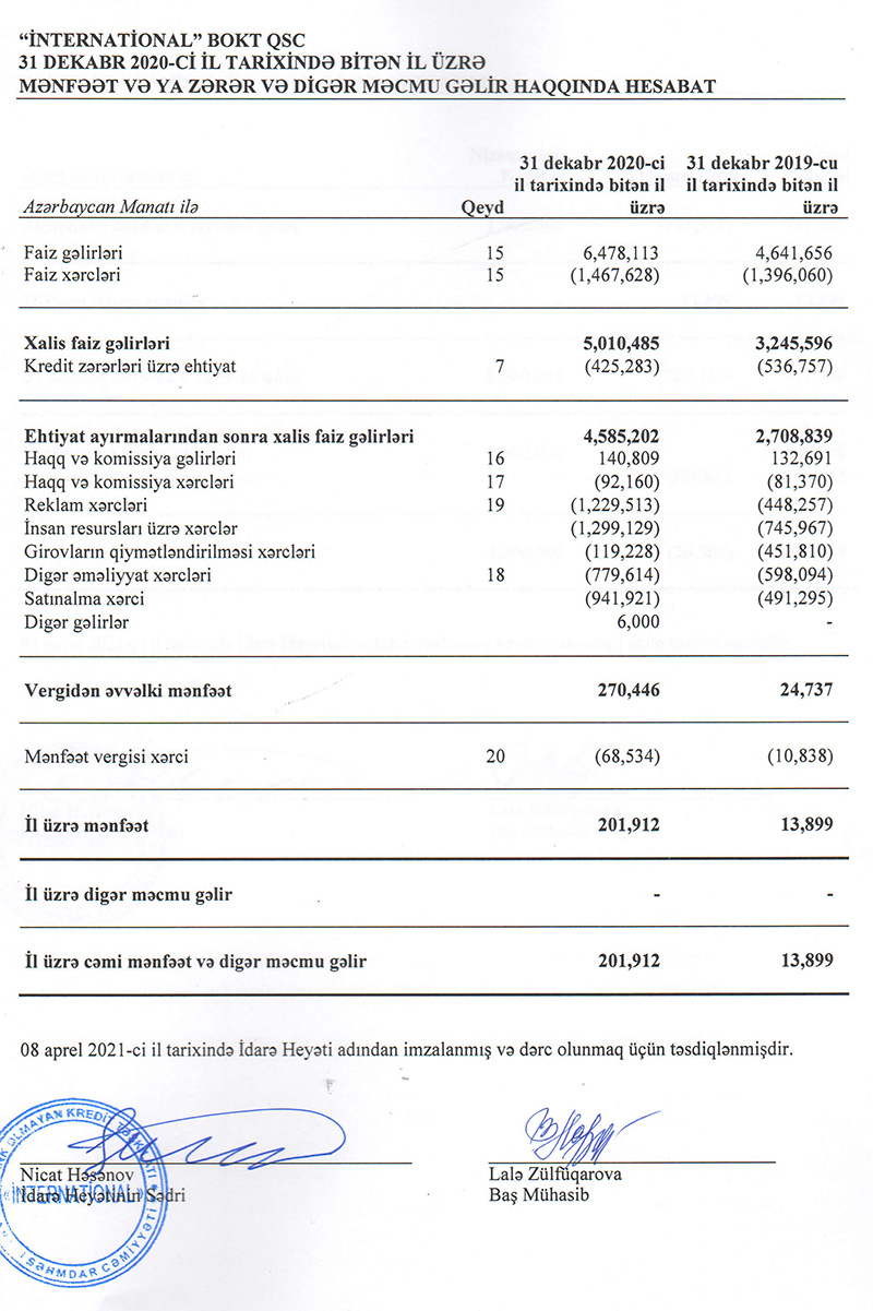 “International” QSC bank olmayan kredit təşkilatı (BOKT) 2020-ci ili 202 min manat xalis mənfəətlə başa vurub.