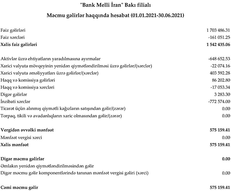 "Bank Melli İran" Bakı filialı 2021-ci ilin ilk 6 ayını 575 min 159 manat xalis mənfəət ilə başa vurub. Bu, ötən ilin eyni dövrü ilə müqayisədə 25% çoxdur. Filial ötən ilin ilk 6 ayını 460 min 875 manat xalis mənfəət ilə bağlamışdı.