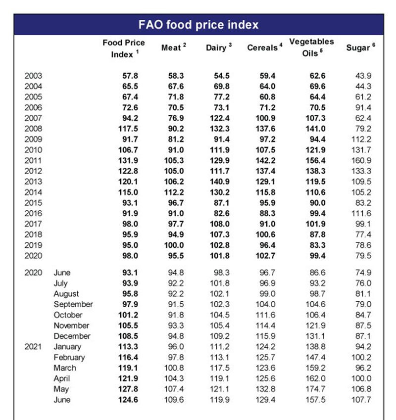 Birləşmiş Millətlər Təşkilatının (BMT) Ərzaq və Kənd Təsərrüfatı Təşkilatının (FAO) məlumatlarına görə, taxıl, yağ, ət və südün qiymətlərindəki dəyişiklikləri izləyən FAO Qida Qiymət İndeksi İyunda May ayı ilə müqayisədə 2,5% geriləyib, ötən ilin İyun ayı ilə müqayisədə isə 33,9% yüksəlib.
