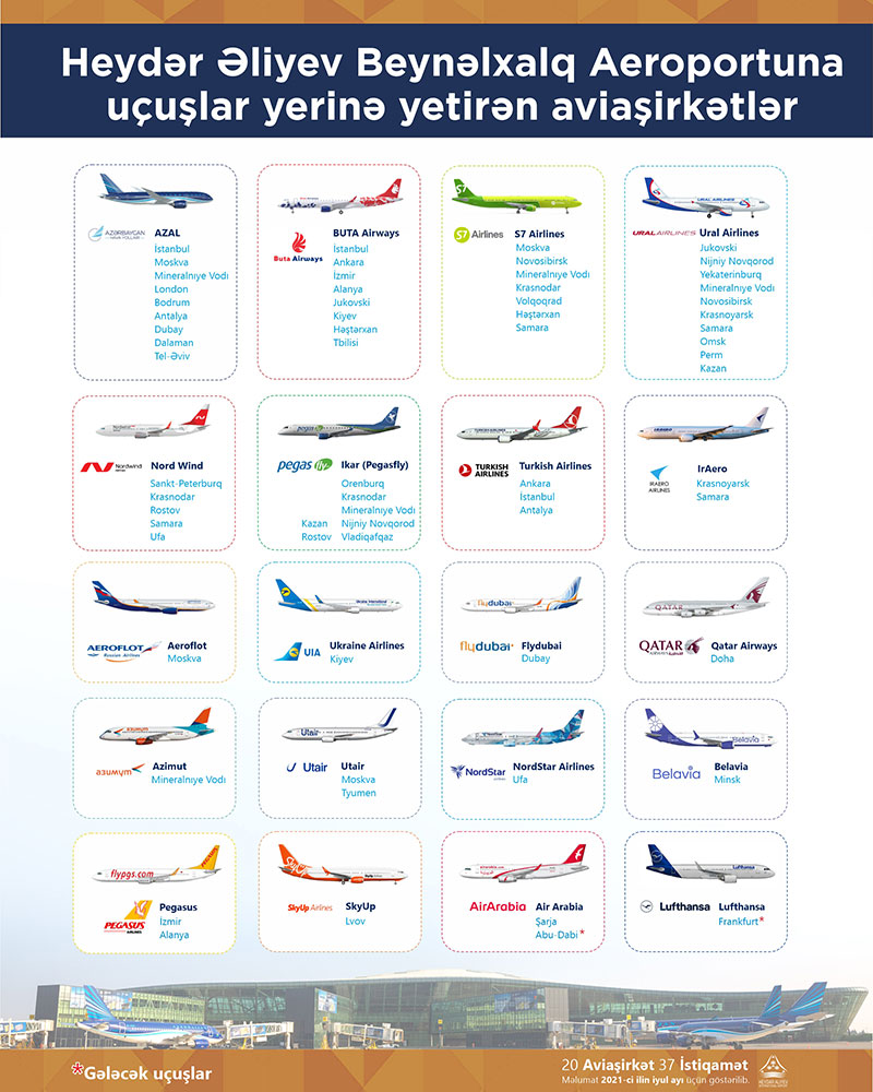 Milli aviadaşıyıcı AZAL və onun törəmə müəssisəsi olan "Buta Airways" aşağıbüdcəli aviaşirkəti ilə yanaşı,Turkish Airlines, Lufthansa, Qatar Airways, Aeroflot, S7, flyDubai kimi iri aviaşirkətlər, habelə Pegasus, SkyUp Airlines kimi aşağıbüdcəli aviaşirkətlər və bir sıra digər aviadaşıyıcılar ölkəyə uçuşlarını bərpa ediblər və ya uçuş icra etməyə hazırlaşırlar.