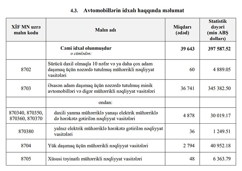 2021-ci ilin yanvar-iyun ayları ərzində (ilk 6 ayda) Azərbaycana 397 milyon 587 min dollar dəyərində 39 min 643 ədəd avtomobil (nəqliyyat vasitələri) idxal edilib.