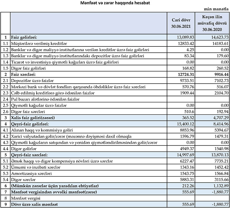 "Muğan Bank" ASC 2021-ci ilin 1-ci yarısını (yanvar - iyun dövrünü) 556 min manat xalis mənfəət ilə başa vurub. Halbuki, Bank ötən ilin eyni dövrünü 1 milyon 881 min manat xalis zərər ilə bağlamışdı.