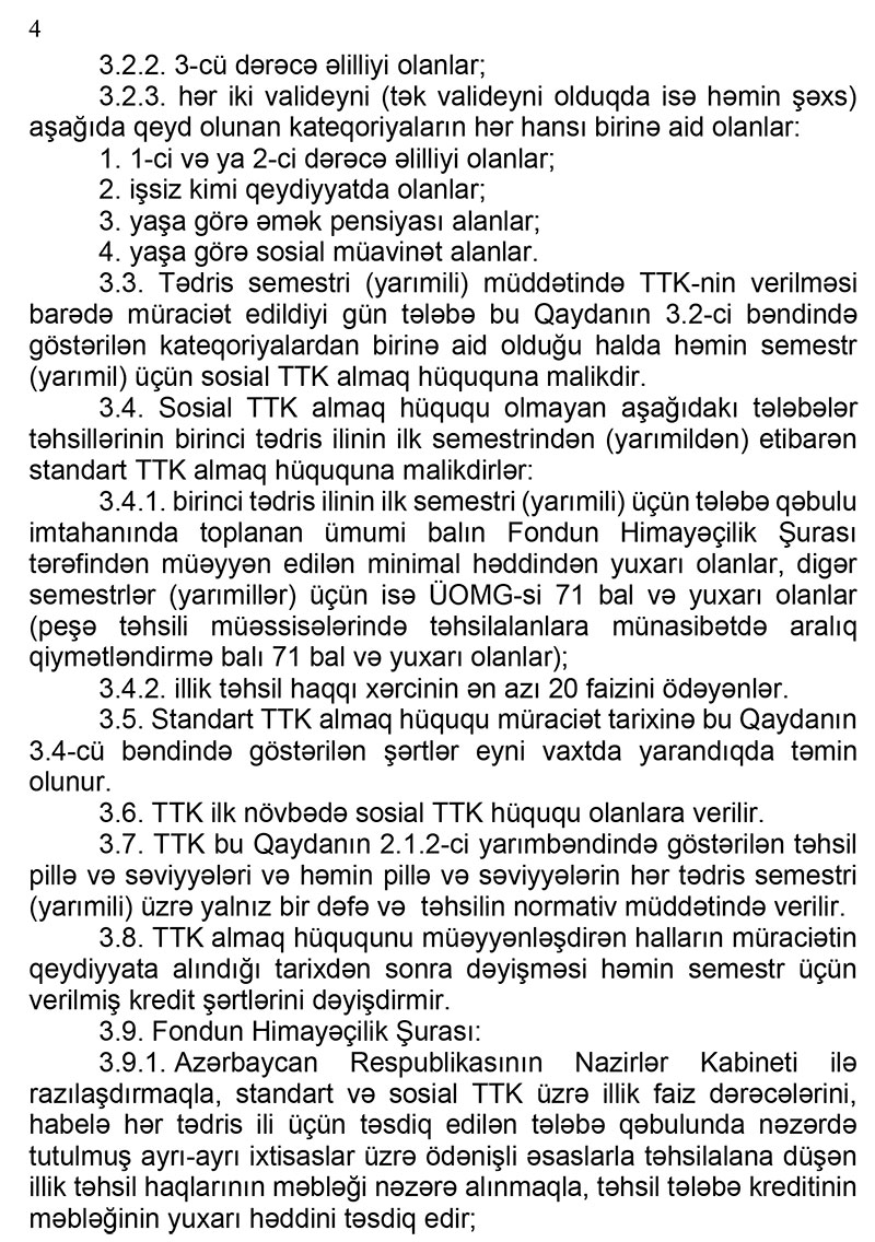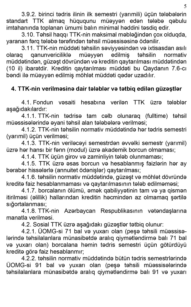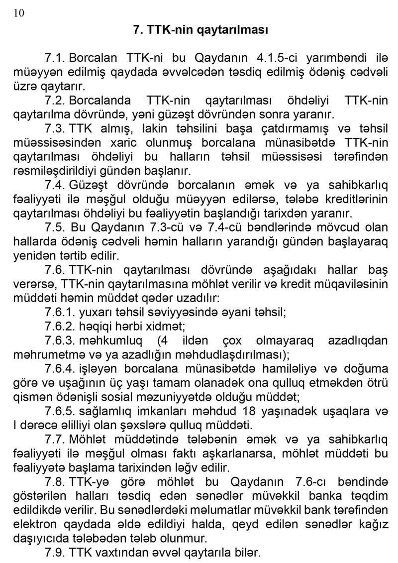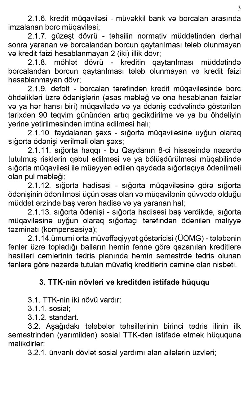 TTK-nin tədrisə tam cəlb olunaraq (fulltime) təhsil müəssisələrində əyani təhsil alan tələbələrə və təhsilin normativ müddətində hər tədris semestri (yarımil) üçün veriləcək. kreditin veriləcəyi semestrdən əvvəlki semestr (yarımil) üzrə hər hansı bir fənn (modul) üzrə akademik borc olmamalıdır. Kredit üçün girov və zaminlik tələb olunmayacaq.