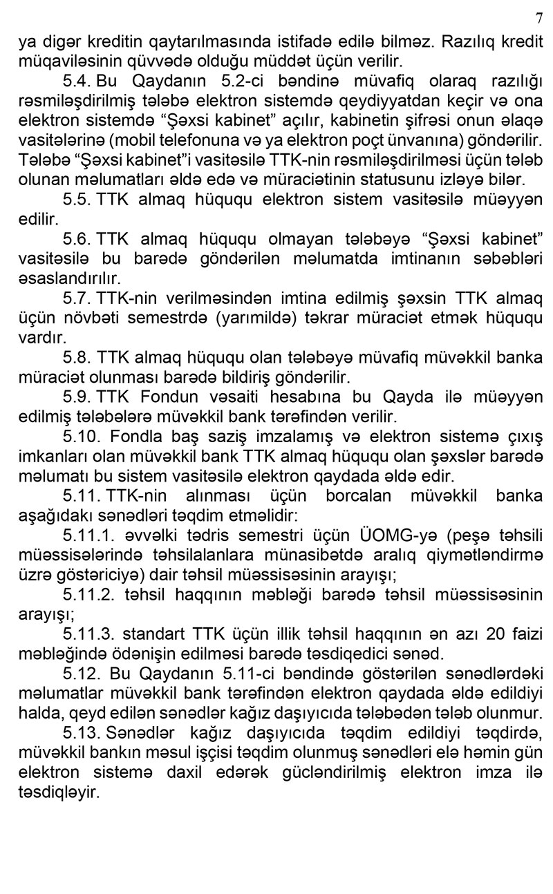 - tələbə - ona aid gəlirlərin, xərclərin, əmlakların və digər zəruri fərdi məlumatların kredit müqaviləsinin qüvvədə olduğu müddətdə aidiyyəti dövlət orqanları və təşkilatları tərəfindən Fondun və müvəkkil bankın sorğusu əsasında ona (onlara) təqdim edilməsinə və muzdla və ya mülki-hüquqi xarakterli müqavilələrlə işlədikdə və ya sahibkarlıq fəaliyyəti ilə məşğul olduqda alacağı əməkhaqqından və ya əldə edəcəyi gəlirdən TTK-nin qaytarılması məqsədilə müvəkkil bankın xeyrinə tutulmaların (gəlirin 20 faizindən çox olmamaq şərtilə) edilməsinə.