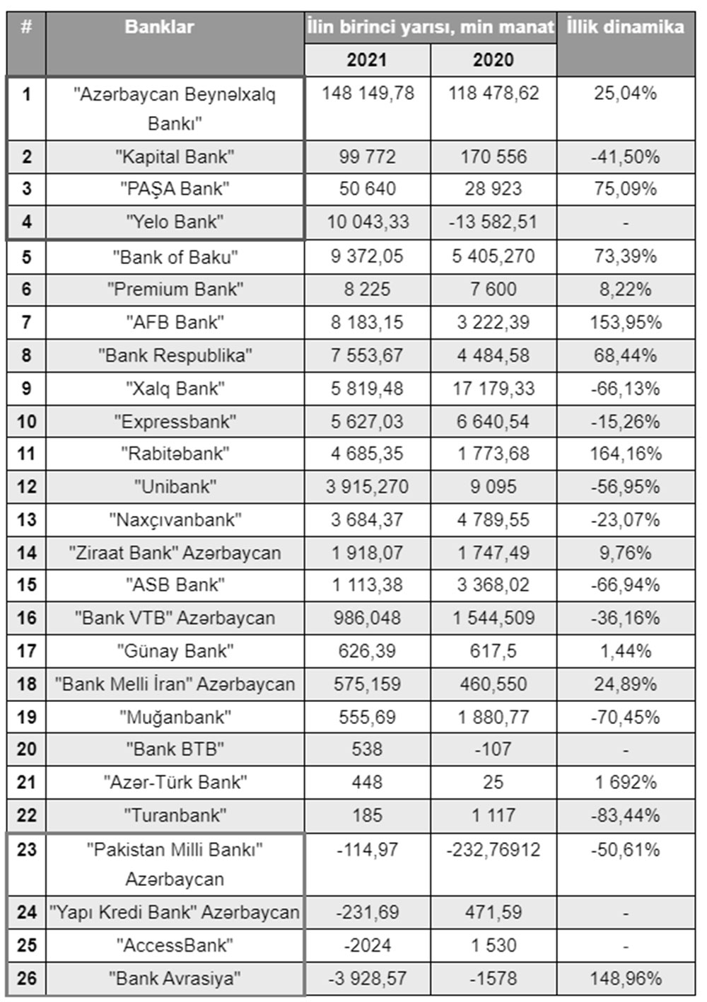 Azərbaycanın bank sektoru 2021-ci ilin birinci yarısını 366,3 milyon manatlıq xalis mənfəətlə yekunlaşdırıb. Bu, ötən ilin eyni dövrü ilə müqayisədə 2,3% azdır.