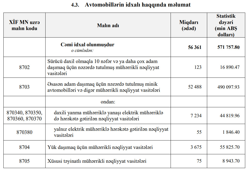 2021-ci ilin yanvar-avqust ayları ərzində (8 ayda) xarici ölkələrdən Azərbaycana 571 milyon 757 min dollar dəyərində 56 min 361 ədəd avtomobil (nəqliyyat vasitələri) idxal edilib.