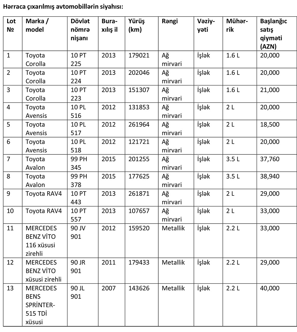 Hərrac üzrə təkliflər Yusif Məmmədəliyev küç., 13 ünvanında yerləşən “PAŞA Bank”ın Baş Ofisinə, Vəliyev Fərhad Əhməd oğlunun adına göndərilməlidir.