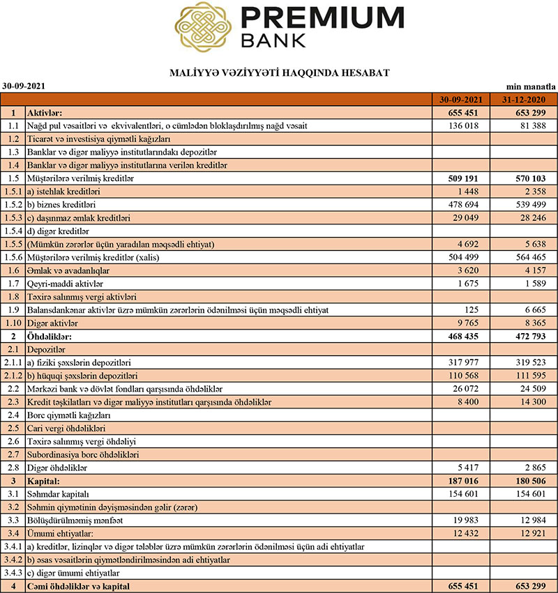 “Premium Bank”ın cəmi aktivləri 2021-ci ilin 9 ayında ötən ilin sonu ilə müqayisədə 2 milyon 152 min manat və ya 0,3% artaraq 655 milyon 451 min manata çatıb. Bank 2020-ci ilin sonunda 653 milyon 299 min manat cəmi aktivlərə malik idi. Aktivlərin artması nağd pul vəsaitlərinin artması ilə əlaqədardır.