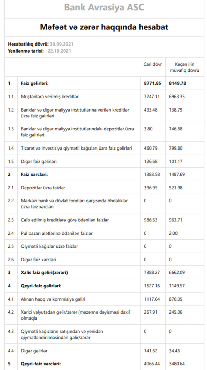 “Bank Avrasiya” ASC 2021-ci ilin 9 ayın 2 milyon 798 min manat xalis zərər ilə başa vurub. Bank ötən ilin eyni dövrünü 196 min manat xalis mənfəət ilə bağlamışdı. Zərərin səbəbi mümkün zərərlər üçün yaradılan məqsədli ehtiyatlara ayırmanın 1,8 dəfə artmasıdır.