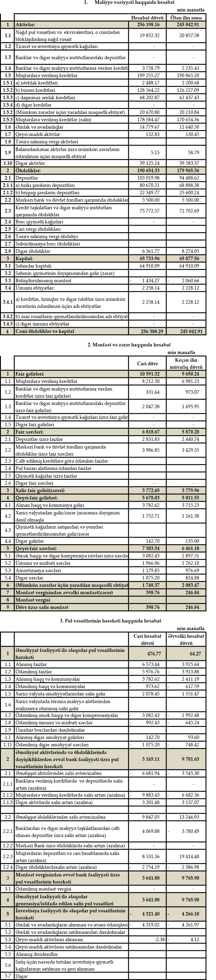 Bankın məcmu kapitalı isə ilin əvvəlinə nisbətən 463.9 min manat artaraq, 65 milyon 311.01 min manata çatıb.