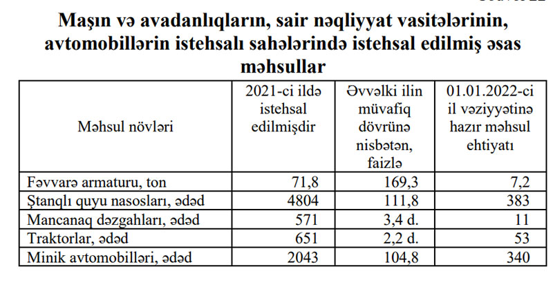 Xatırladaq ki, 2020-ci ildə Azərbaycanda 1949 ədəd və ya 2019-cu illə müqayisədə 411 ədəd az minik avtomobili, 300 ədəd və ya 2019-cu illə müqayisədə 66.9% az traktor istehsal edilmişdi.