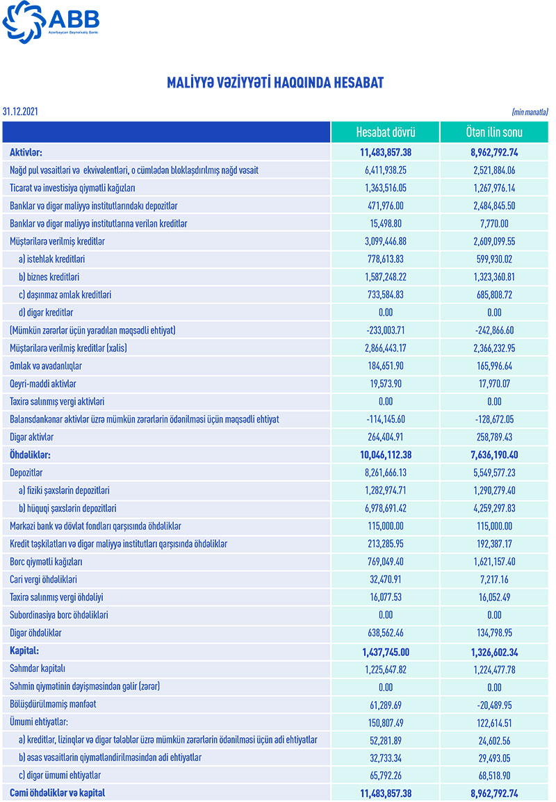 ABB-nin cəmi aktivləri 2021-ci ildə 2020-ci illə müqayisədə 2 milyard 521 milyon 64 min manat və ya 28,1% artaraq ötən ilin sonunda 11 milyard 483 milyon 857 min manata çatıb.