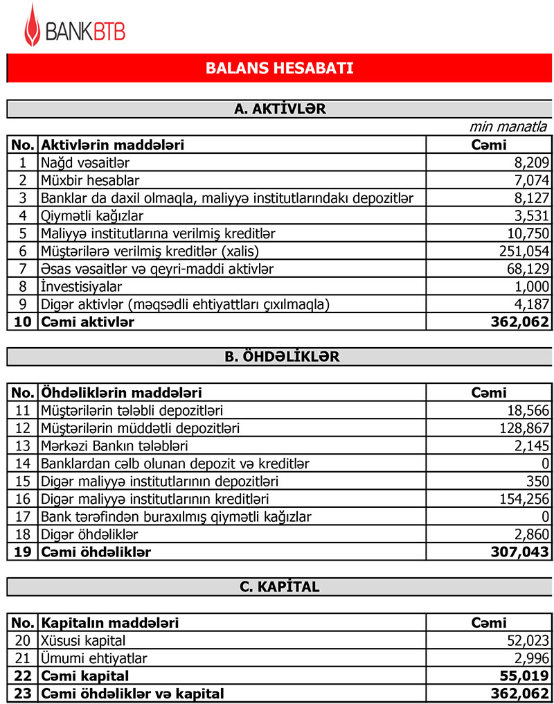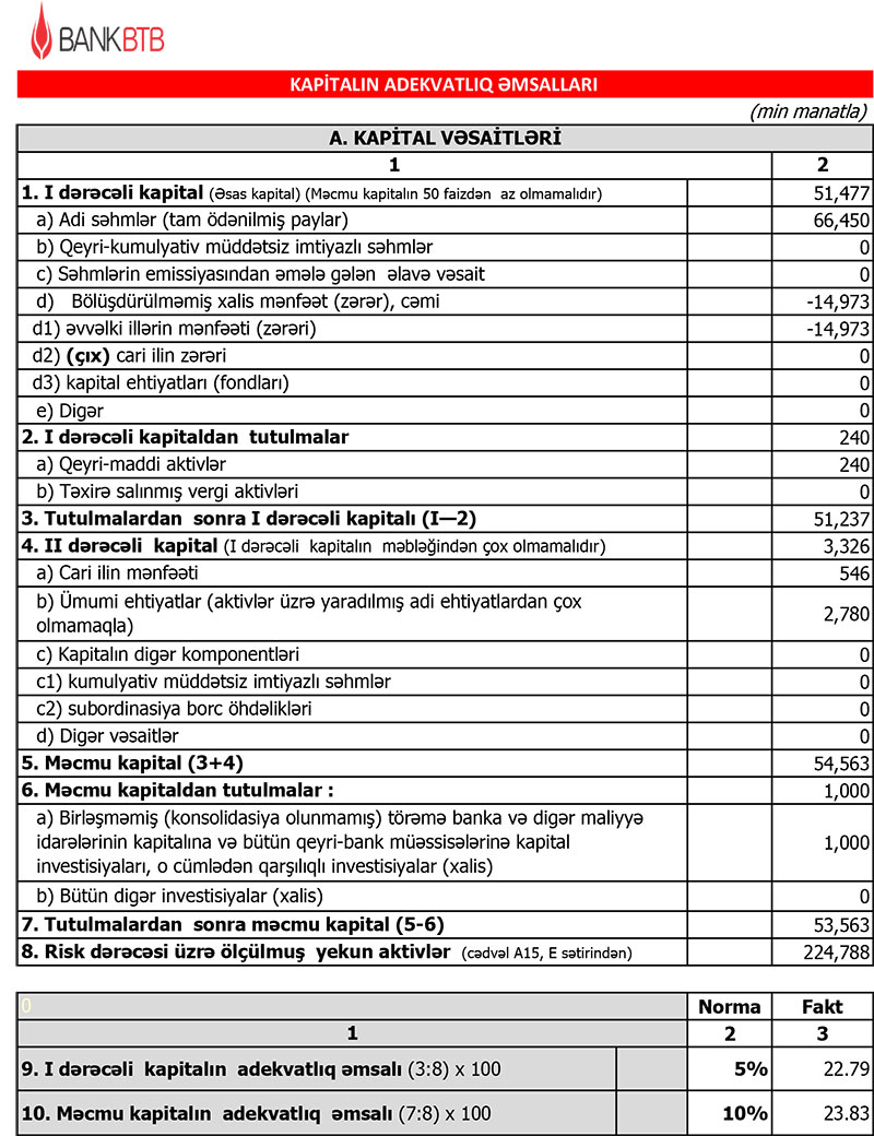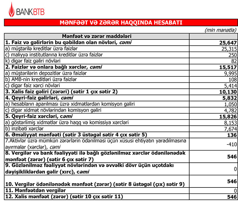 Müqayisə üçün qeyd edək ki, 2020-ci ildə "Bank BTB"nin əməliyyat mənfəəti 1 milyon 944 min manat təışkil etmişdi. Mümkün zərərlərin ödənilməsi üçün xüsusi ehtiyatın yaradılmasına 11 milyon 75 min manat ayrılması ilə əlaqədar olaraq 9 milyon 130 min manat zərər yaranmışdı.