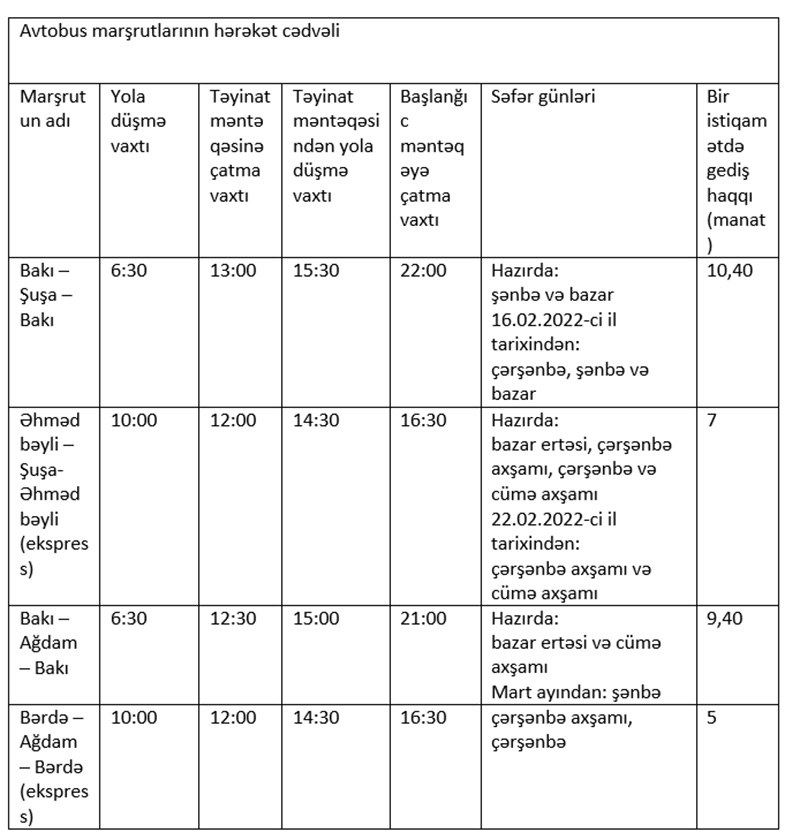 İşğaldan azad edilmiş ərazilərə sərnişindaşıma həyata keçirən avtobus marşrutlarının hərəkət qrafikində dəyişiklik edilib.