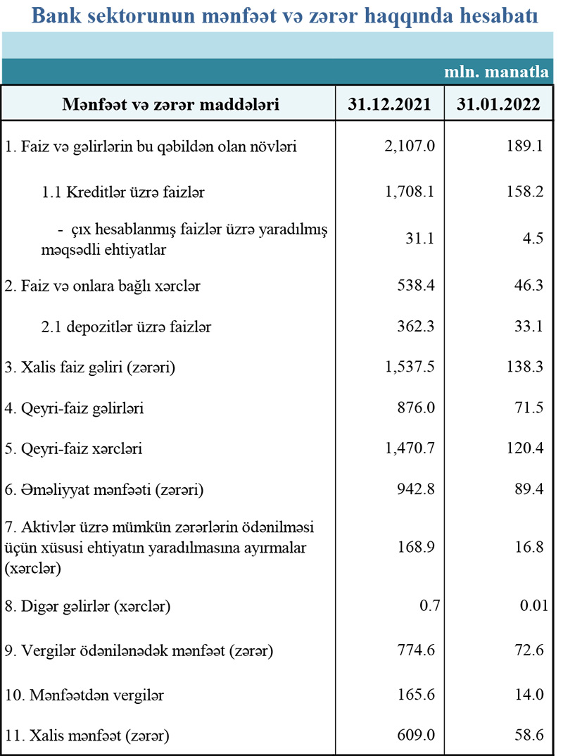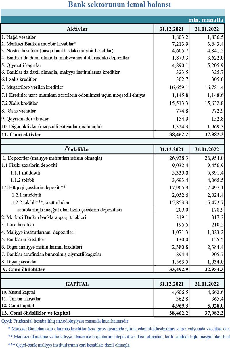 31 yanvar 2022-ci il tarixinə olan bank sektorunun əsas göstəriciləri açıqlanıb.