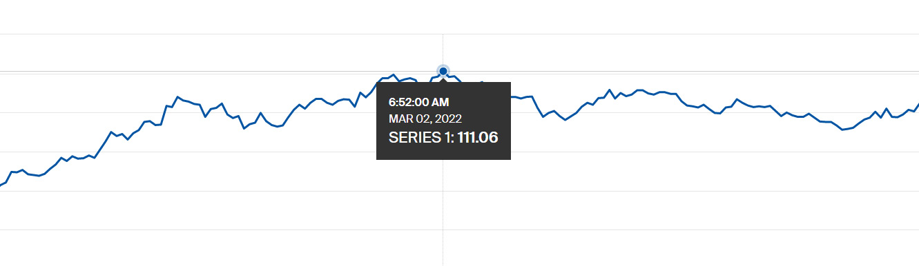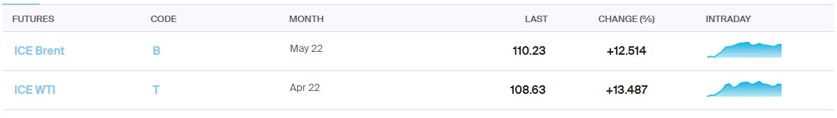 Rusiyanın Ukraynaya müdaxiləsi və sonra elan edilən sanksiyalar ilə əlaqədar olaraq Brent nefti 110 dolları, ABŞ xam nefti 108 dolları keçib. Brent nefti 12%-dən çox, ABŞ xam nefti isə 13%-dən çox bahalaşıb. Brent neftinin qiyməti 111,06 dolları da test edib.