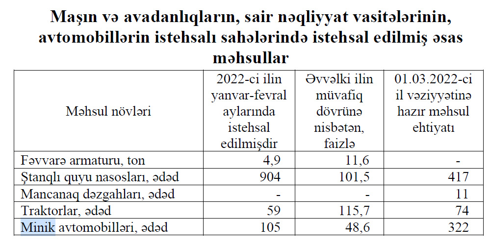 2022-ci ilin yanvar-fevral aylarında Azərbaycanda 105 ədəd və ya ötən ilin müvafiq dövrü ilə müqayisədə 111 ədəd (51,4% az) az minik avtomobili istehsal olunub.