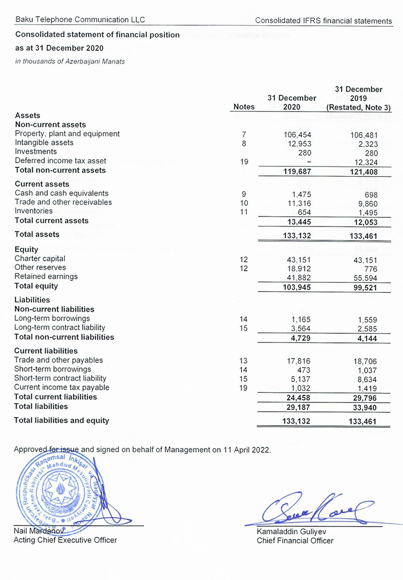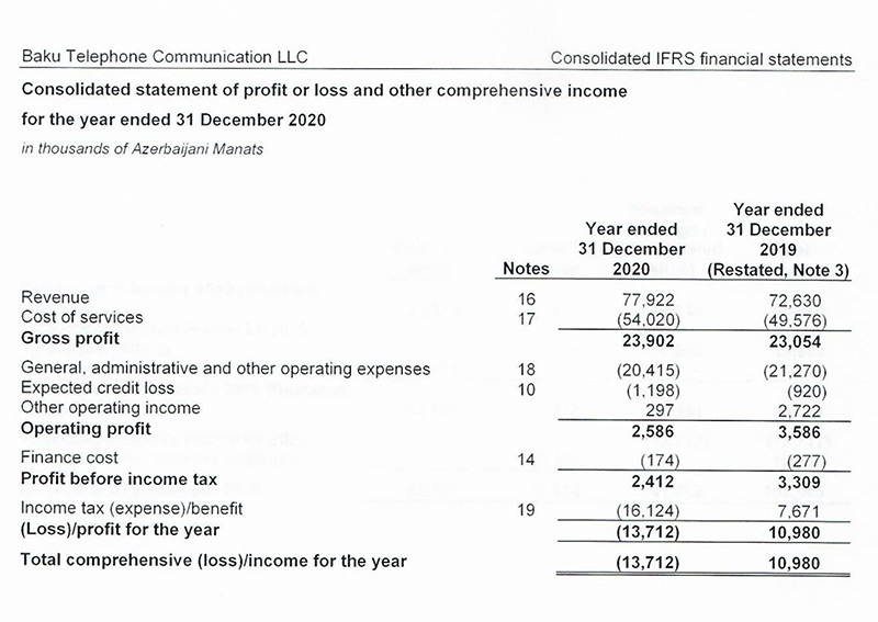 Marja-nın məlumatına görə, “Bakı Telefon Rabitəsi” MMC-nin 2020-ci il audit edilmiş maliyyə hesabatlarının qısa icmalında bildirilir ki, cəmiyyətin gəlirləri, əsasən, internet və telefon xidmətləri üzrə formalaşır və 2019-cu illə müqayisədə 2020-ci ilin gəlirləri 7,3% artaraq 77 milyon 922 min manata çatmışdır. Gəlirlərdəki artıma uyğun olaraq, maya dəyəri üzrə 2020 xərclərində də müvafiq artım müşahidə edilmişdir. Cəmiyyətin təsərrüfat fəaliyyətində əməliyyatların genişlənməsinə baxmayaraq, xərclərin düzgün idarəedilməsi nəticəsində ümumi, inzibati və digər əməliyyat xərcləri 2020-ci ildə 4% azalaraq 20 milyon 415 min manat təşkil etmişdir. Pandemiya və müharibə şəraiti ilə əlaqədar digər əməliyyat gəlirlərində isə kəskin azalma baş vermiş və əməliyyat fəaliyyəti üzrə mənfəətin 28% azalaraq 2 milyon 586 min manat təşkil etməsinə səbəb olmuşdur.