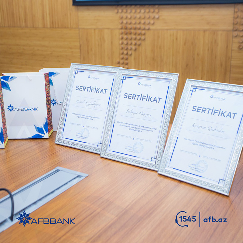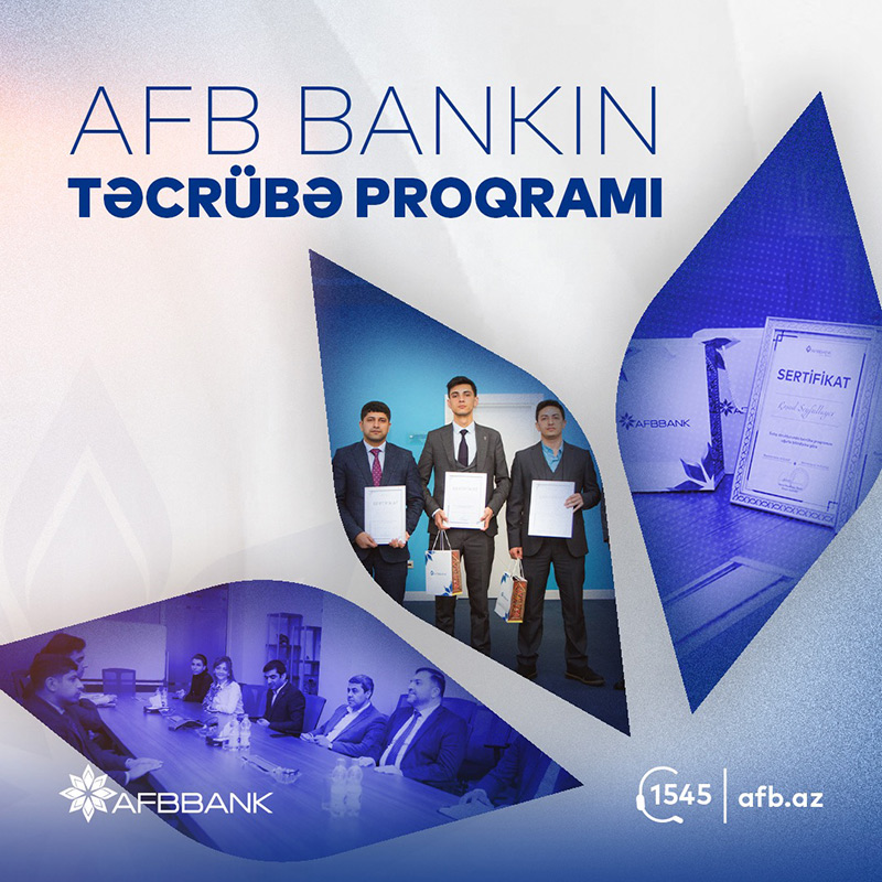 Qeyd edək ki, AFB Bank tərəfindən təşkil edilən təcrübə proqramlarının köməyi ilə gənclər işləyərək öyrənmək, real iş mühiti ilə tanışlıq, güclü komandada işləmək imkanları qazanırlar. Təcrübə proqramını uğurla başa vuran şəxslər Bank tərəfindən sertifikatla təltif edilərək, Bankın işçi ehtiyacı çərçivəsində işlə təmin olunur və ya ehtiyat kadr bazasına daxil edilirlər.