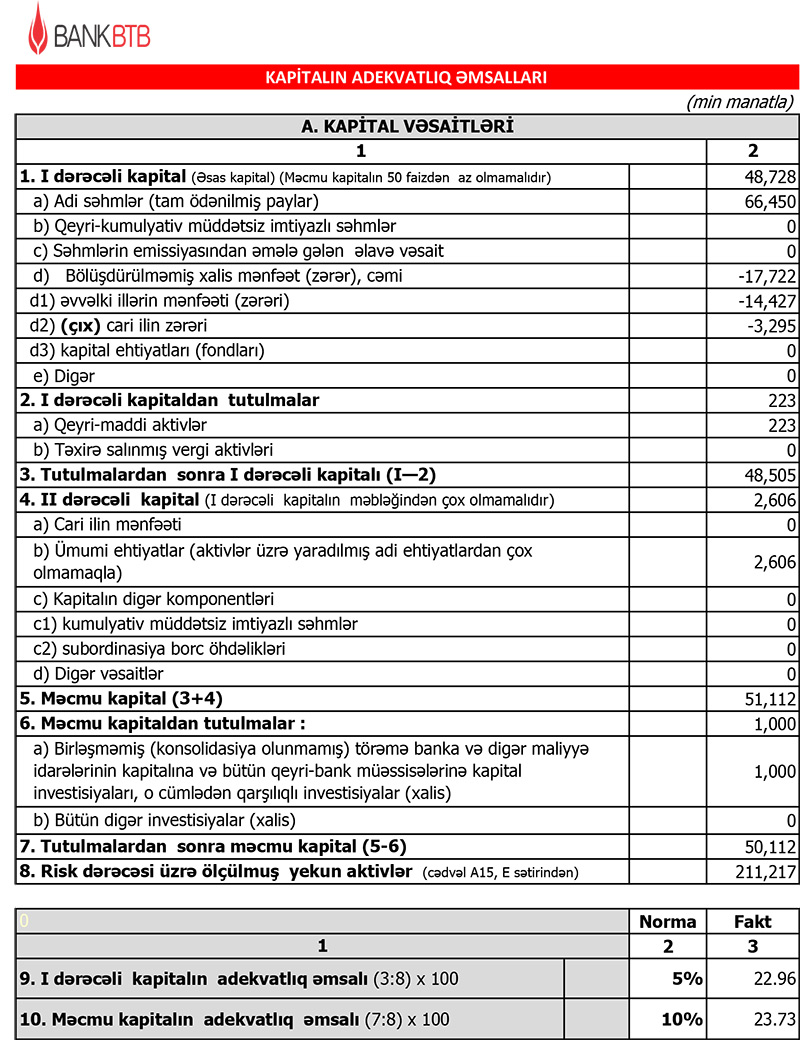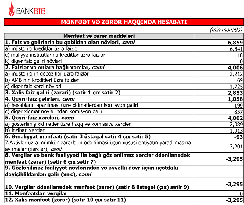 "Maliyyə nəticələrinə əsasən, 1-ci rüb ərzində Bank BTB-nin aktivlərinin həcmində 6 % artım qeydə alınıb, bankın cəmi aktivləri 356 milyon 788 min manata çatıb. Digər əsas göstərici isə bankın kredit portfelinin artmasıdır ki, hesabat dövründə bankın kredit portfeli 261 milyon 411 min manat təşkil etmiş, bu isə ötən ilin eyni dövrü ilə müqayisədə 18% artım deməkdir. Sözügedən dövrdə bankın fiziki şəxslərin müddətli depozit portfelinin həcmi 26% artaraq 130 milyon 507 min manat təşkil etmişdir",- press-relizdə bildirilir.