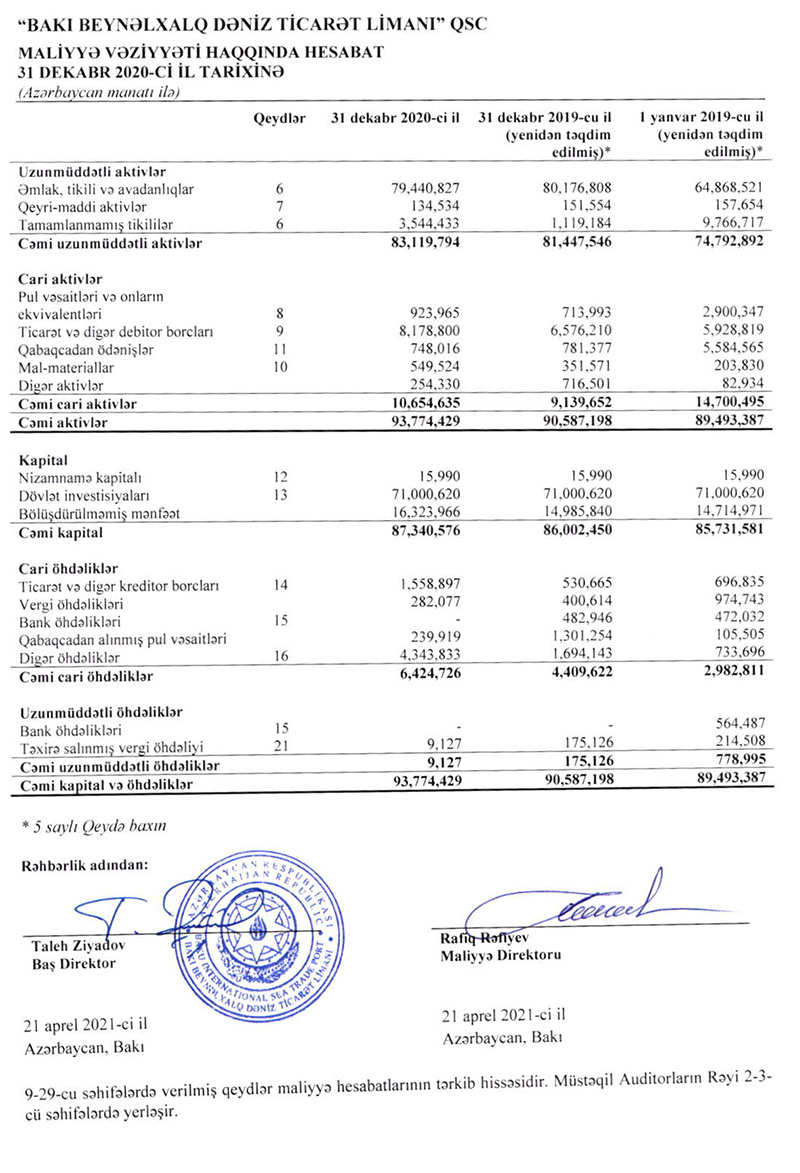 2021-ci il yanvarın 1-nə Bakı Limanının aktivləri 93 milyon 774 min manat olub ki, bu da illik müqayisədə 3,5% çoxdur. Hesabat dövründə qurumun öhdəlikləri 40,3% artaraq 6 milyon 433 min manata, balans kapitalı isə 1,5% artaraq 87 milyon 341 min manata çatıb.