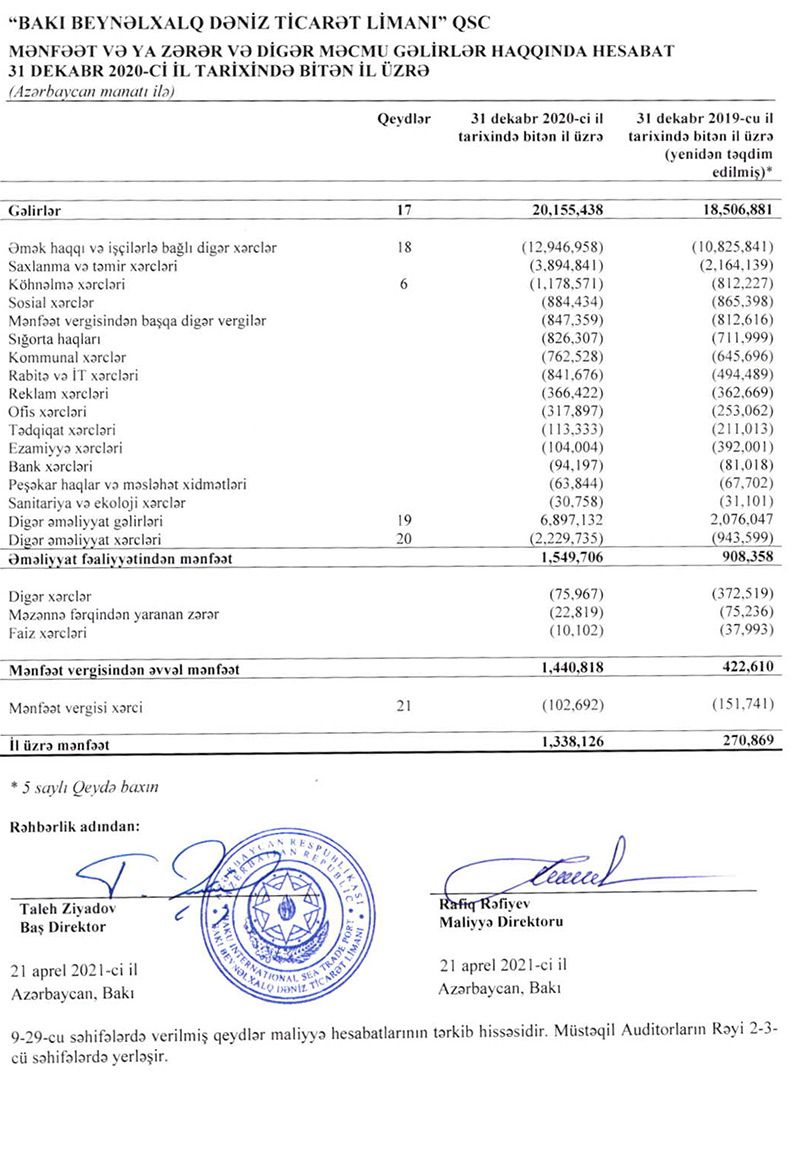 “Bakı Beynəlxalq Dəniz Ticarət Limanı” QSC (Bakı Limanı) 2020-ci ili 1 milyon 338 min manat xalis mənfəətlə başa vurub.