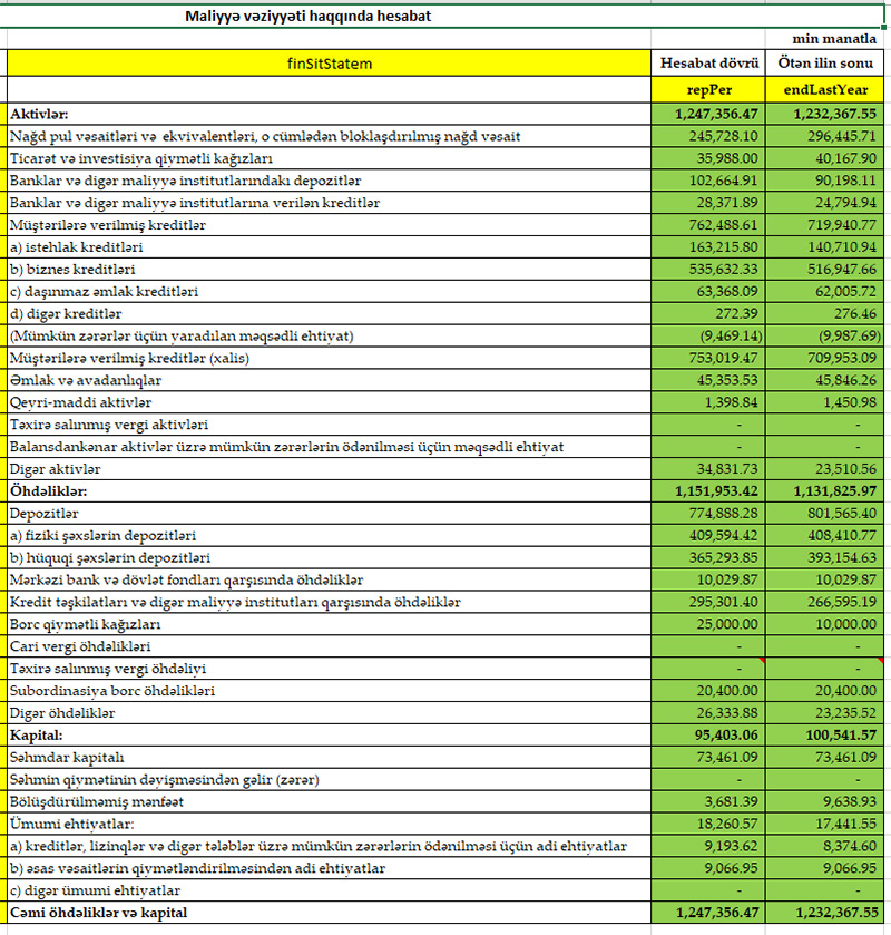 “1 aprel 2022-ci il tarixinə bankın aktivləri 1,25 milyard manatdan çox olmuşdur ki, bu da ötən ilin eyni dövrü ilə müqayisədə 12% çoxdur. Açıqlanmış hesabatdan həmçinin görünür ki, Bank davamlı inkişaf üçün kifayət qədər yüksək kapital ehtiyatına malikdir. Belə ki, Bankın məcmu kapitalı 14% artaraq 99,4 milyon manat olmuş və minimum məcmu kapital normasını təqribən 2 dəfə üstələmişdir.