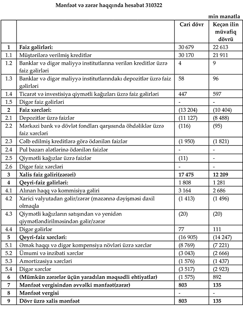 Müqayisə üçün qeyd edək ki, 2021-ci ilin yanvar-mart dövründə “AccessBank”ın cəmi əməliyyat gəlirləri 23 milyon 894 min manat, cəmi əməliyyat xərcləri 24 milyon 651 min manat, xərclər gəlirlərdən çox olduğu üçün əməliyyat zərəri 757 min manat təşkil etmişdi. Ehtiyatlardan azad olmuş 892 min manat hesabına həm əməliyyat zərəri bağlanmış, həm də Bankın 135 min manat xalis mənfəəti yaranmışdı.