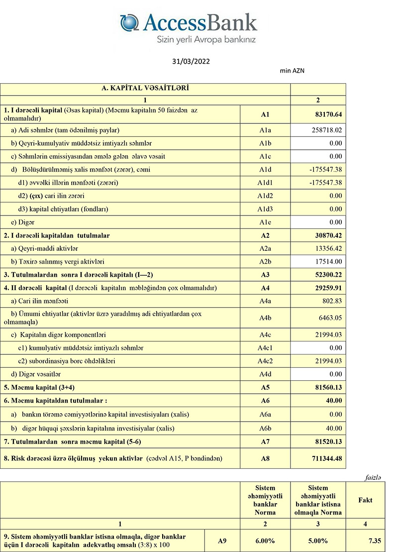 31 Mart 2022-ci il tarixində “AccessBank”ın məcmu kapitalı 81 milyon 520 min manat təşkil edib.