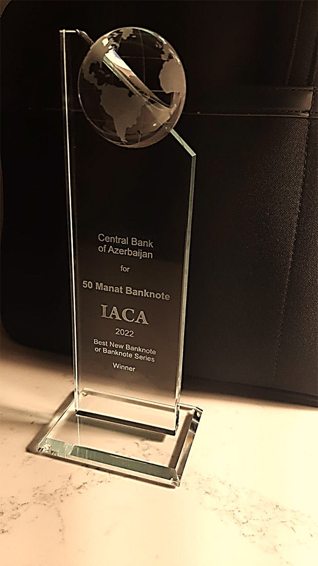 2022-ci ilin 22 fevral tarixində “Beynəlxalq Pul Nişanları Assosiasiyası” (IACA-ABŞ) tərəfindən dünyanın aparıcı mərkəzi banklarının iştirakı ilə ABŞ-ın Vaşinqton şəhərində beynəlxalq konfrans keçirilmiş, Azərbaycanın yenilənmiş 50 manatlıq pul nişanı mövzusuna, dizaynına və təhlükəsizlik sistemlərinə görə “Dünyanın ən Yaxşı yeni Banknotu” tituluna layiq görülərək qalib seçilmişdir