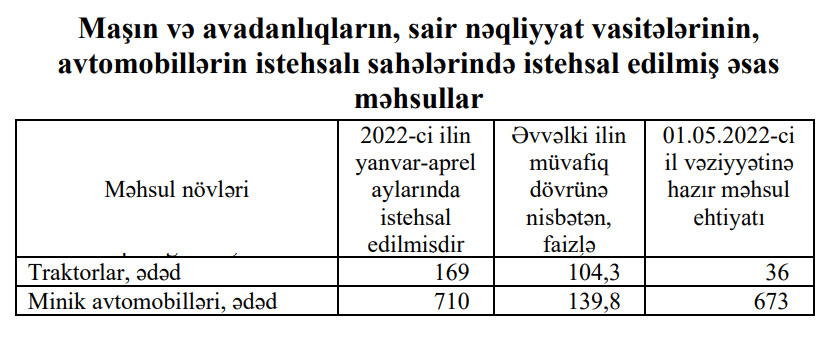 Azərbaycanda 2022-ci ilin yanvar-aprel aylarında ötən ilin eyni dövrü ilə müqayisədə 4,3% çox olmaqla 169 ədəd traktor istehsal edilib. 01.05.2022-ci il vəziyyətinə hazır məhsul ehtiyatı 36 ədəd təşkil edib.