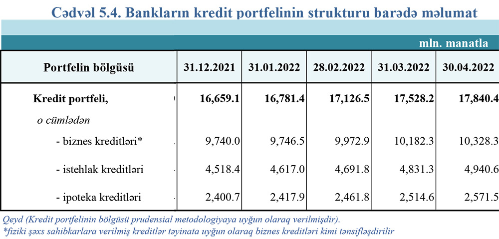 Mart ayının sonu ilə müqayisədə Apreldə bank sektorunun biznes kreditləri portfeli 146 milyon manat artaraq 10 milyard 328,3 milyon manata, istehlak kreditləri portfeli 109,3 milyon manata artaraq 4 milyard 940,6 milyon manata, ipoteka kreditləri portfeli isə 56,9 milyon manat artaraq 2 milyard 571,5 milyon manata çatıb.