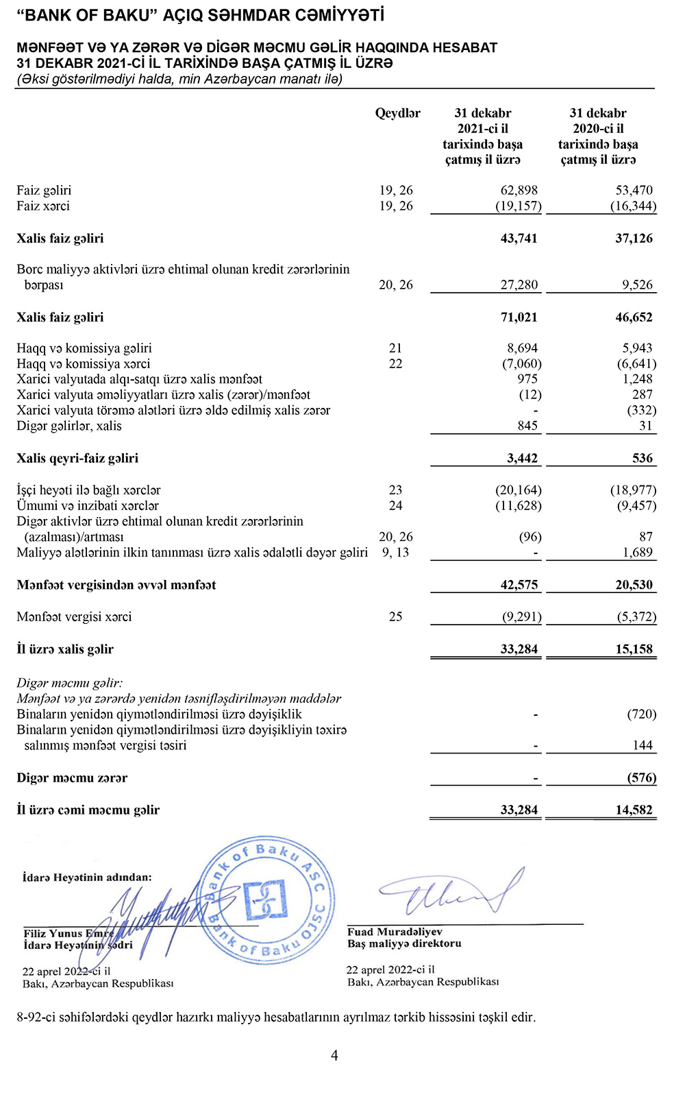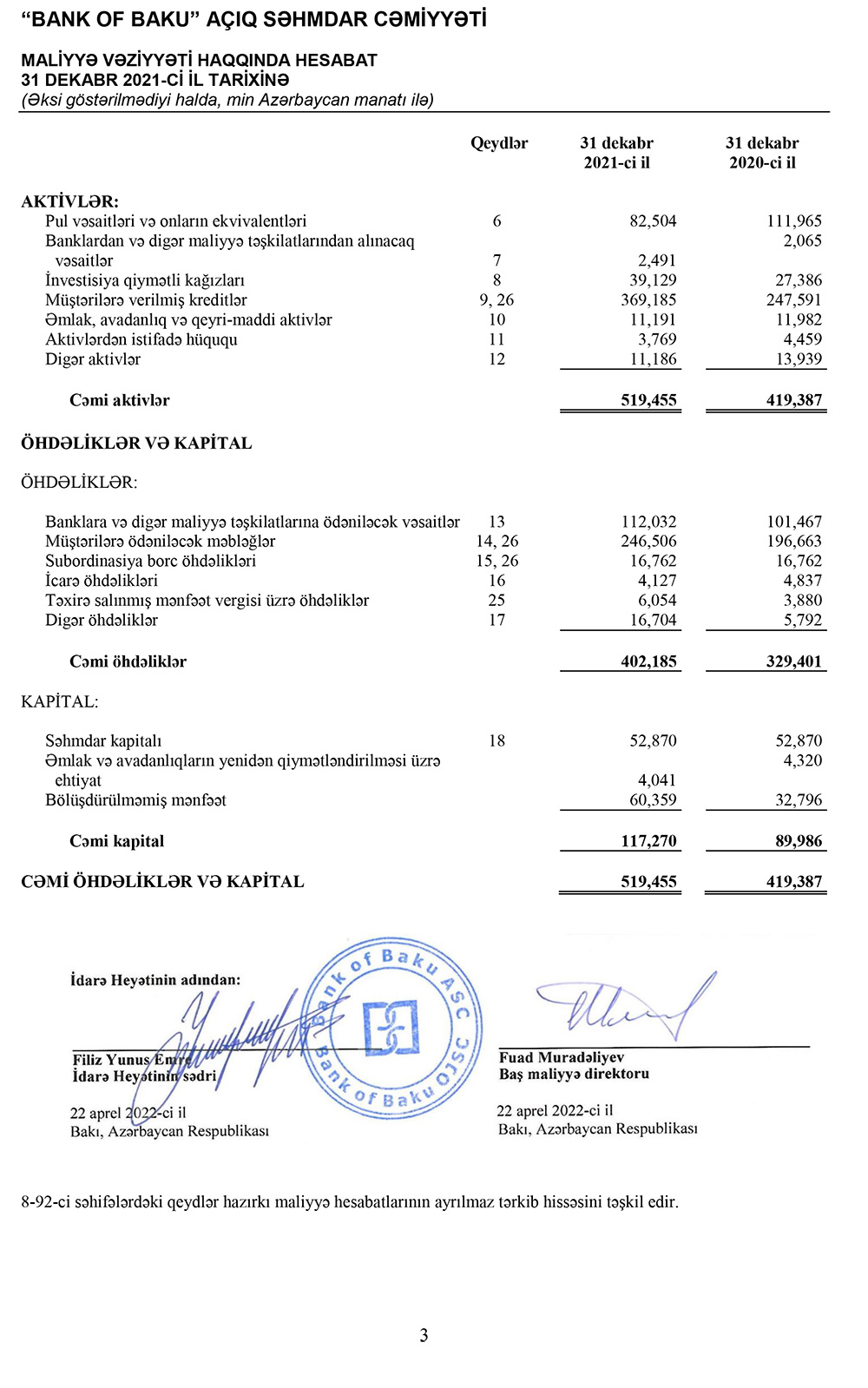 “Bank of Baku” ASC 31 dekabr 2021-ci il tarixində başa çatmış il üzrə Beynəlxalq Maliyyə Hesabatı Standartlarına uyğun hazırlanmış Maliyyə Hesabatları və Müstəqil Auditorların Rəyini rəsmi İnternet səhifəsində dərc edib.