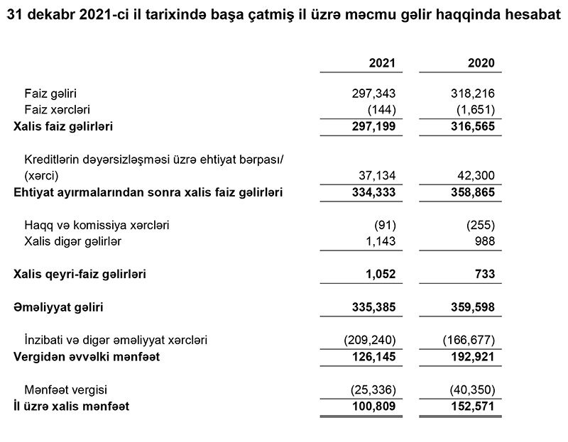 “Azmikroinvest” Bank Olmayan Kredit Təşkilatı MMC 2021-ci ili 100 min 809 manat xalis mənfəət ilə başa vurub. Halbuki, təşkilat 2020-ci ili 152 min 571 manat xalis mənfəət ilə bağlamışdı. Beləliklə, 2020-ci illə müqayisədə 2021-ci ildə “Azmikroinvest” BOKT-un xalis mənfəəti 34% azalıb.