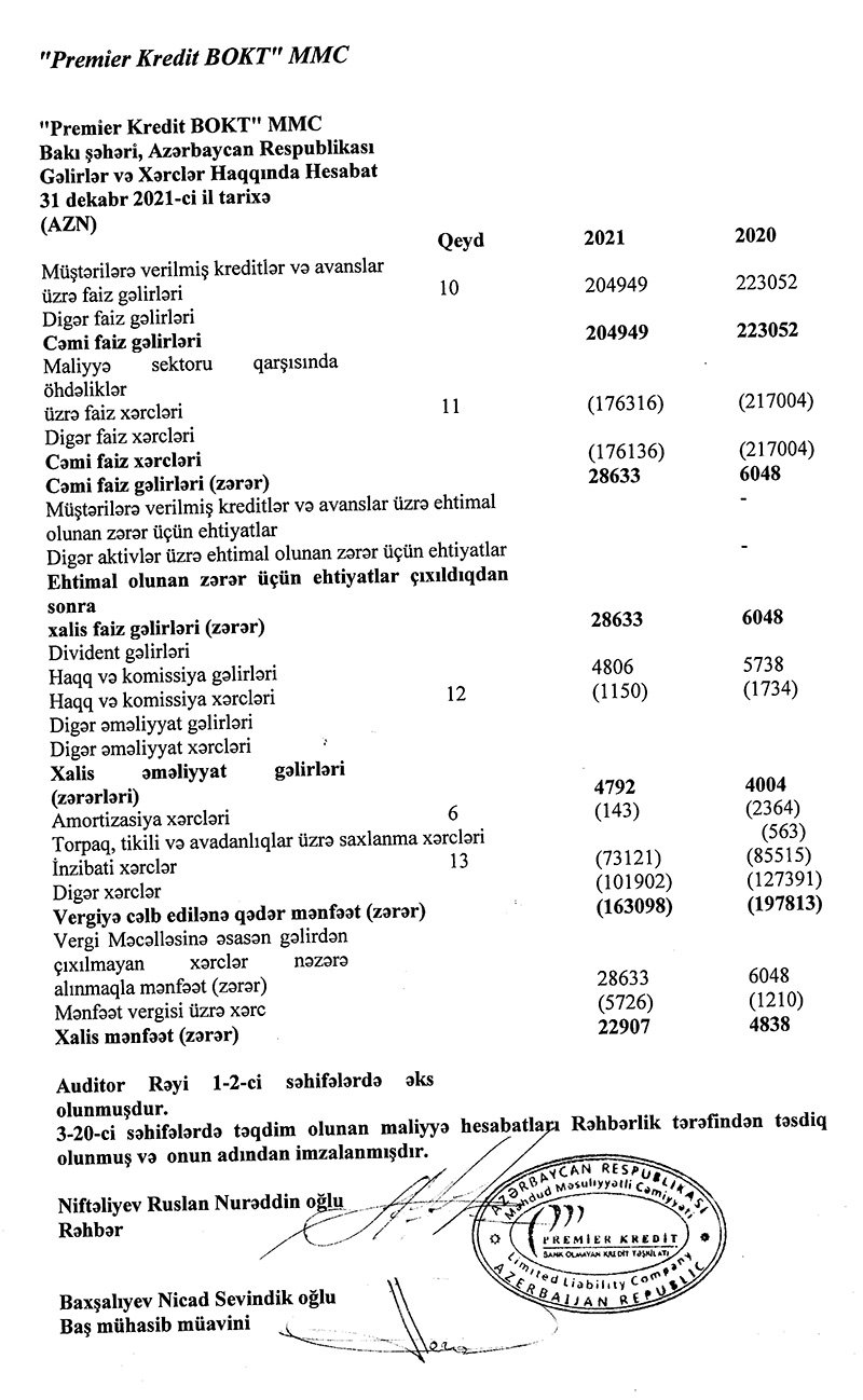 2020-ci illə müqayisədə 2021-ci ildə "Premier Kredit BOKT" kredit portfeli (müştərilərə verilmiş kreditlər) 38 min manat artaraq 1 milyon 295 min manata çatıb.