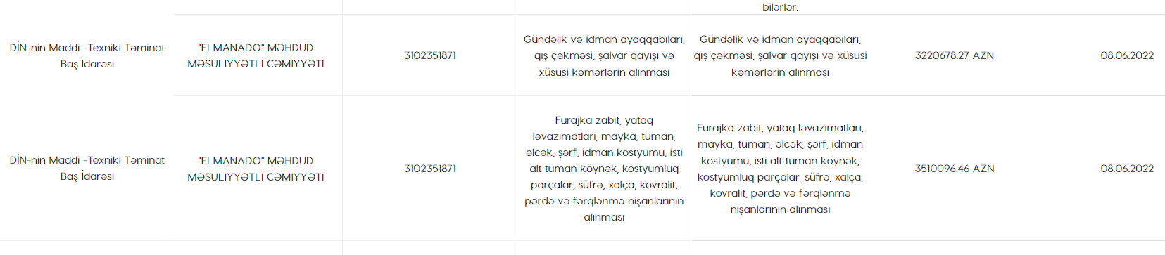 Həmçinin, "Elmanado" MMC İdarənin "Furajka zabit, yataq ləvazimatları, mayka, tuman, əlcək, şərf, idman kostyumu, isti alt tuman köynək, kostyumluq parçalar, süfrə, xalça, kovralit, pərdə və fərqlənmə nişanlarının alınması" ilə bağlı keçirdiyi tenderin qalibi olub və 3 milyon 510 min 6 manatlıq müqavilə imzalayıb.