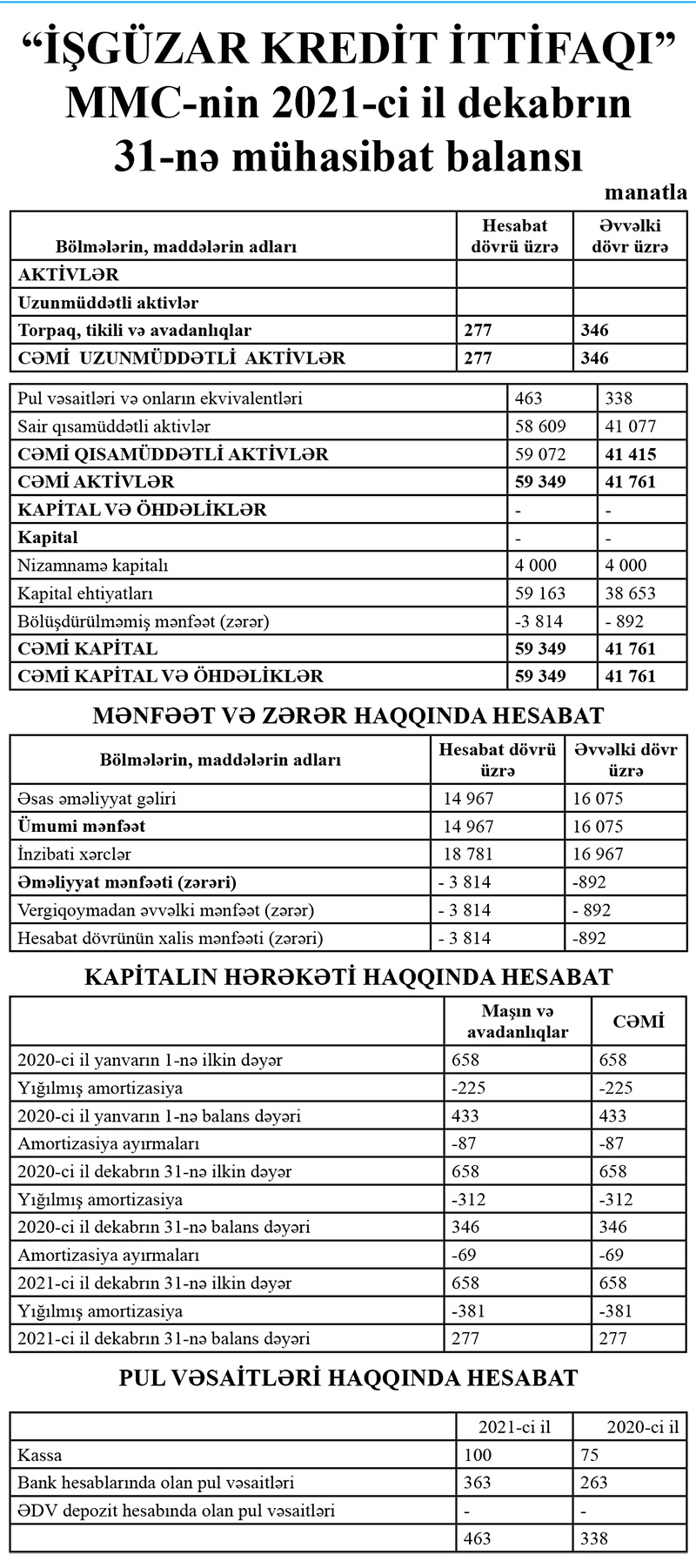 “İşgüzar Kredit İttifaqı” MMC-nin 2021-ci il ili 3 min 814 manat xalis zərər ilə başa vurub. İttifaq 2020-ci ili 892 manat xalis zərər ilə bağlamışdı.