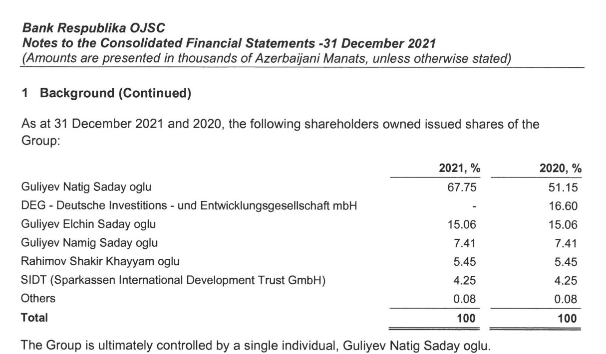 Marja.az Bankın illik audit hesabatına istinadən xəbər verir ki, mühüm dəyişiklik Almaniyanın DEG İnvestisiya və İnkişaf Korporasiyasının "Bank Respublika" ASC-nin nizamnamə kapitalındakı 16,60% payını satmasıdır. DEG-in payını Bankın ən böyük səhmdarı olan Natiq Quliyev alıb və nəticədə onun nizamnamə kapitalındakı payı 51,15%-dən 67,75%-ə yüksəlib.