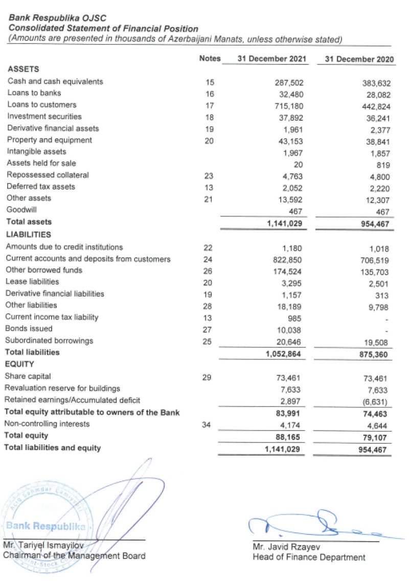 Konsolidə edilmiş audit hesabatına görə "Bank Respublika" qrupu 2021-ci ili 9 milyon 58 min manat xalis mənfəət ilə başa vurub. Qrup 2020-ci ili 6 milyon 980 min manat xalis mənfəət ilə bağlamışdı. Ötən il "Bank Respublika"nın cəmi aktivləri ilk dəfə 1 milyard manatı keçərək hesabat ilinin sonunda 1 milyard 141 milyon manat təşkil edib.
