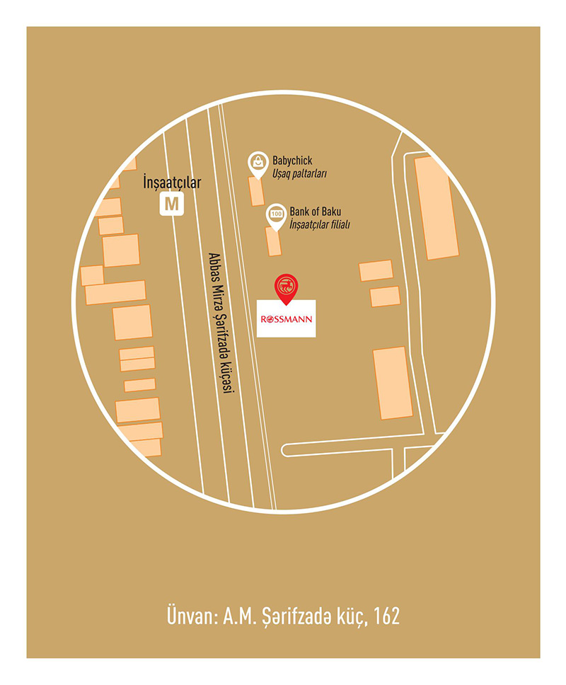 “Rossmann”ın ilk mağazası Bakının Yasamal rayonu A.M.Şərifzadə küçəsi, 162 (“İnşaatçılar” metrostansiyasının çıxışı) ünvanında yerləşir.