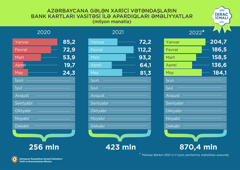 2022-ci ilin yanvar-may aylarında isə əcnəbilər bank kartları vasitəsi ilə 870,4 milyon manatlıq əməliyyat aparıblar.